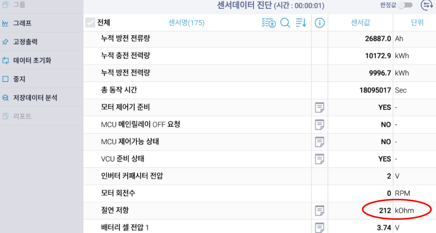 💡 참고: 통상적으로 전기차 고전압 시스템의 절연 저항은 최소1M Ohm 이상이어야 정상으로 간주됩니다. 진단 결과인 212 kOhm은 기준치에 한참 미달하는 수치로, 절연파괴가 발생했음을 명확히 보여줍니다.