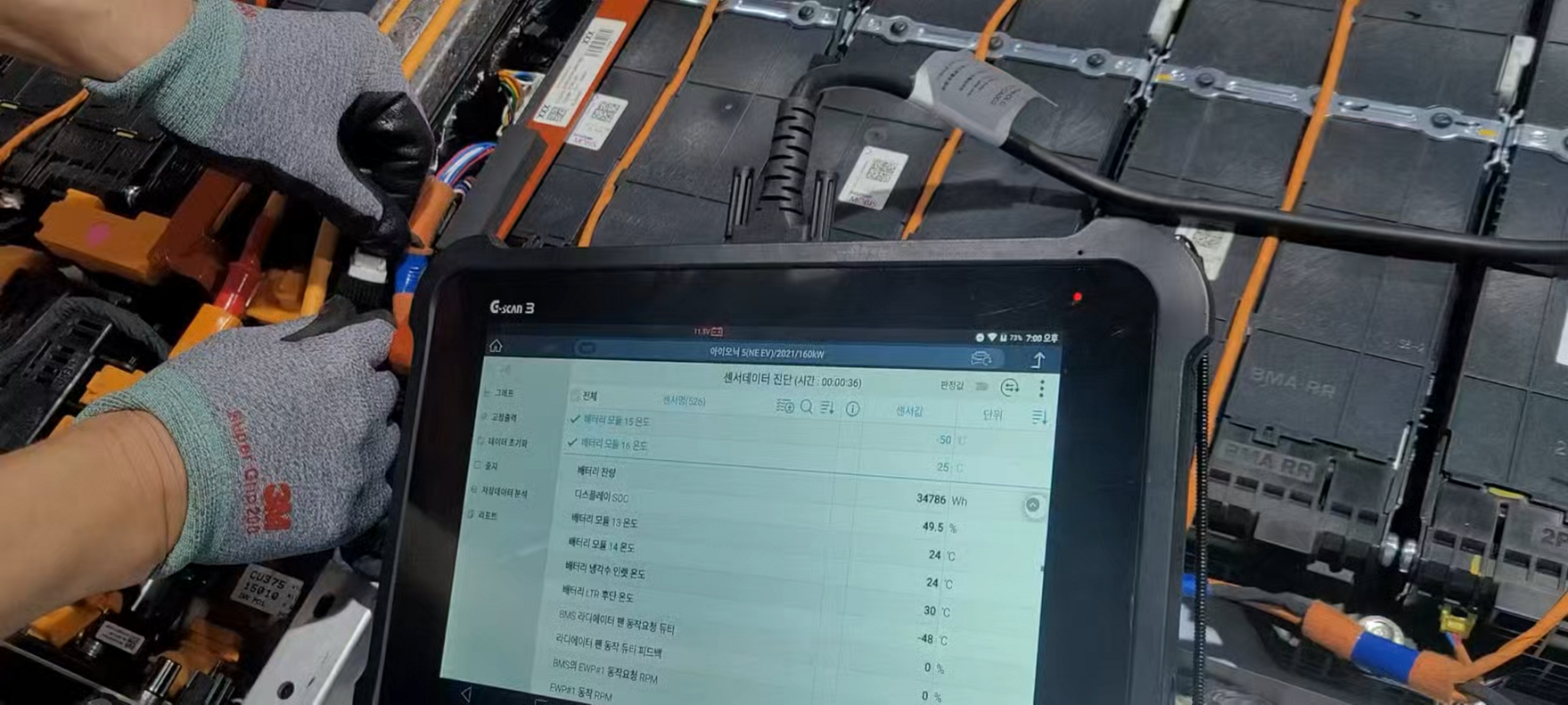배터리 팩을 열어 하네스를 교체하고 스캔 툴로 센서데이터를 모니터링하는 장면입니다.