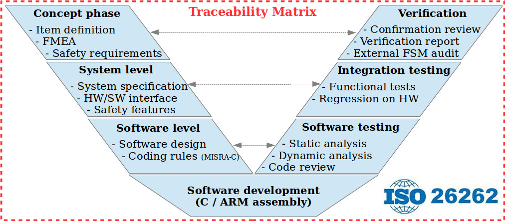 ISO 26262는 전형적인 V-모델 구조를 사용합니다.